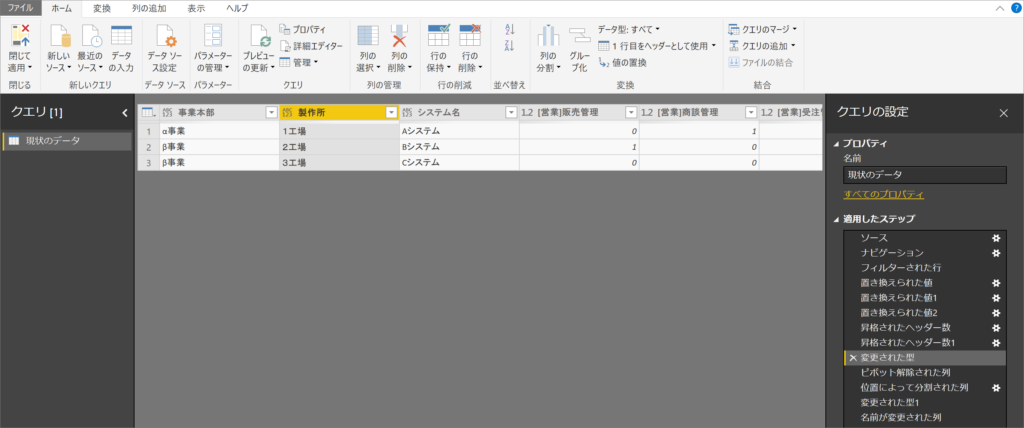 一つ一つのステップを詳細に説明すると冗長なので今回は省きますが、クエリエディターの「適用したステップ」にある、【フィルターされた行~変更された型】までで、データの整形を行っています。基本は余計な行などを削除しているイメージです。